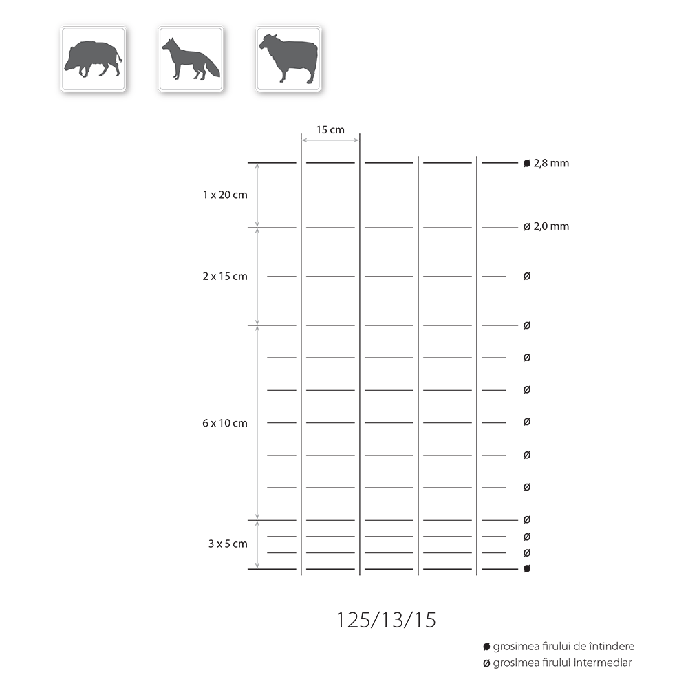 - Distanța dintre sârmele pe verticală: 15 cm