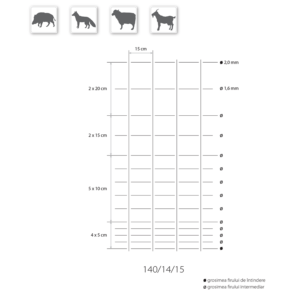 - Distanța dintre sârmele pe verticală: 15 cm