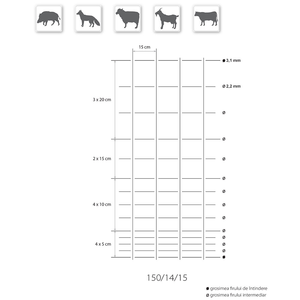 Plasă înnodată farmer H=150 cm fir ∅ 2.2 mm, ochi 15 cm, 14 fire orizontale